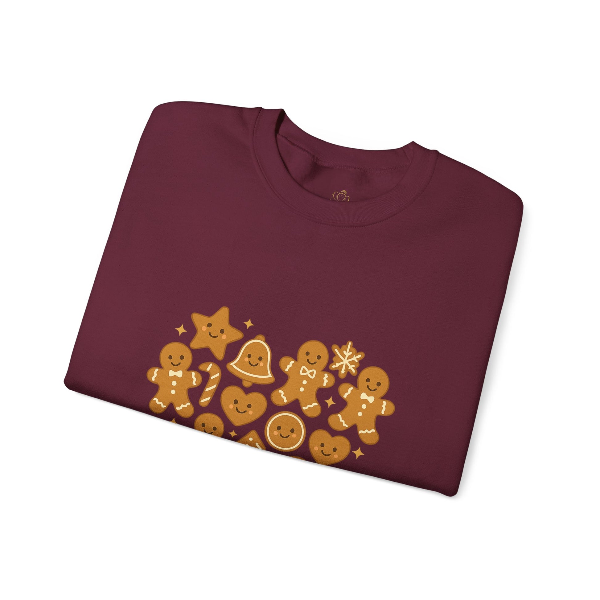 Bake the season sweet with this heartwarming holiday sweatshirt! The “Baked With Love” design features a heart-shaped cluster of gingerbread cookies – from stars and trees to smiley faces and gingerbread people, all arranged with sparkle and joy.