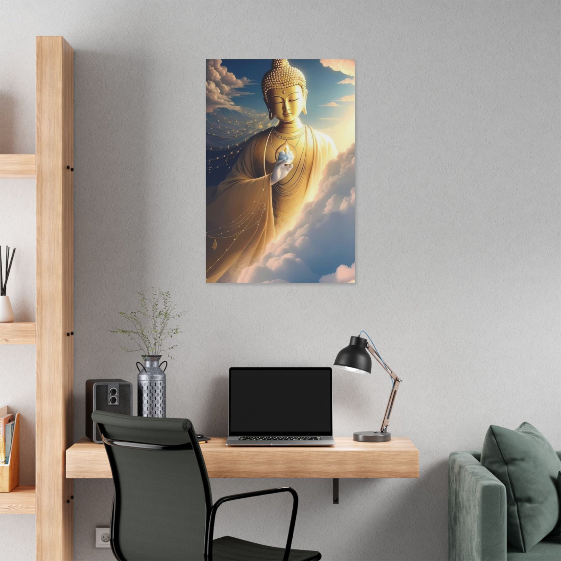 Invite divine light and inner peace into your home with our Golden Buddha in the Clouds Canvas. This ethereal artwork captures Buddha cloaked in radiant gold, holding a symbolic lotus light, as he emerges through celestial clouds bathed in soft sunlight.