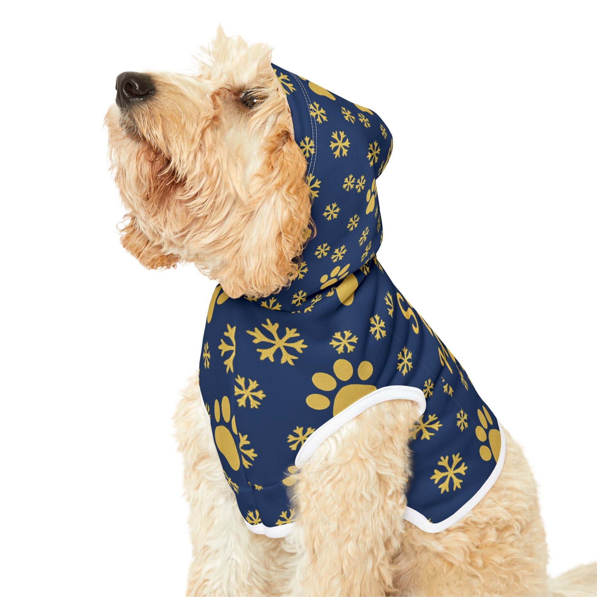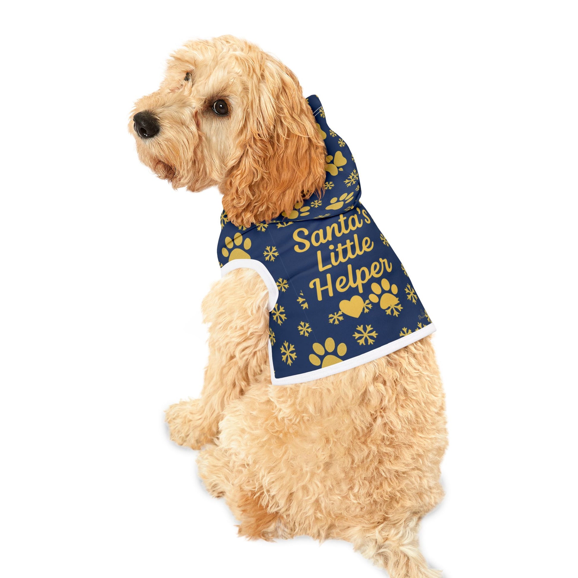 Get your furry friend ready for the holidays with our adorable “Santa’s Little Helper” hoodie! Designed in a festive navy blue and gold palette with snowflakes, stars, and paw prints, this cozy hoodie makes your pet part of the Christmas magic.