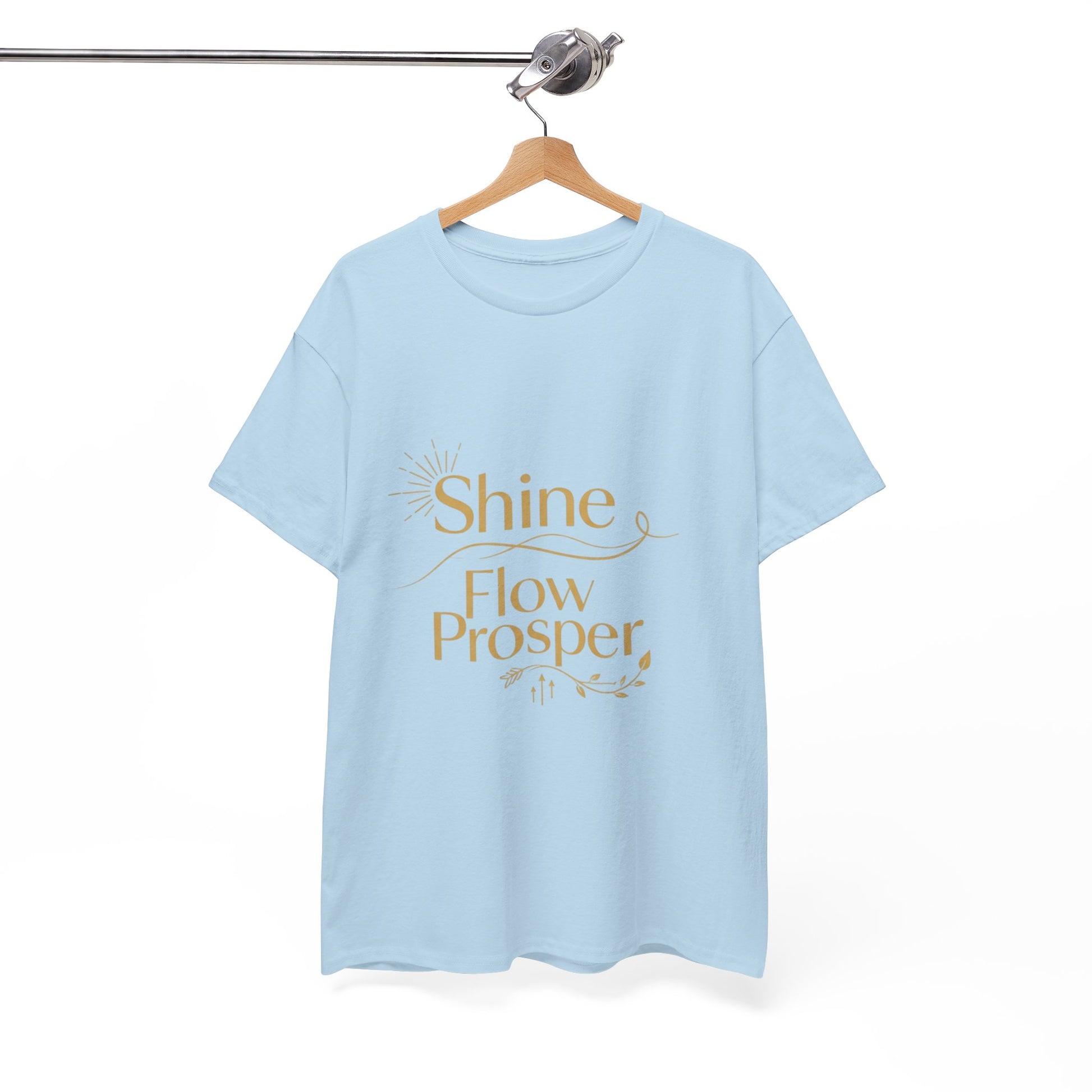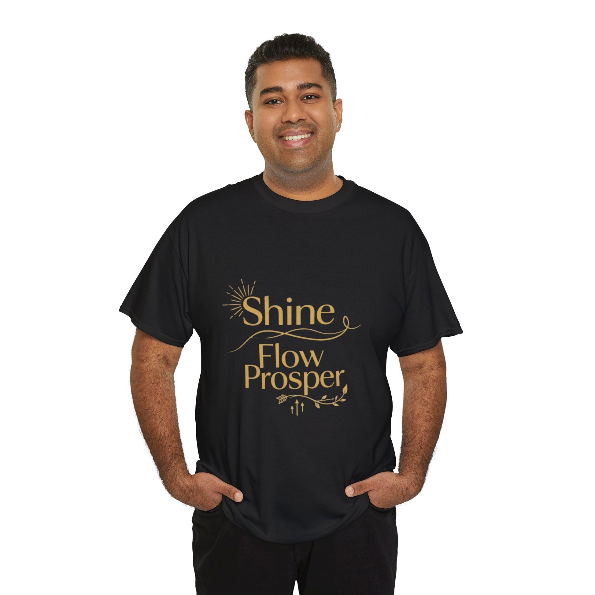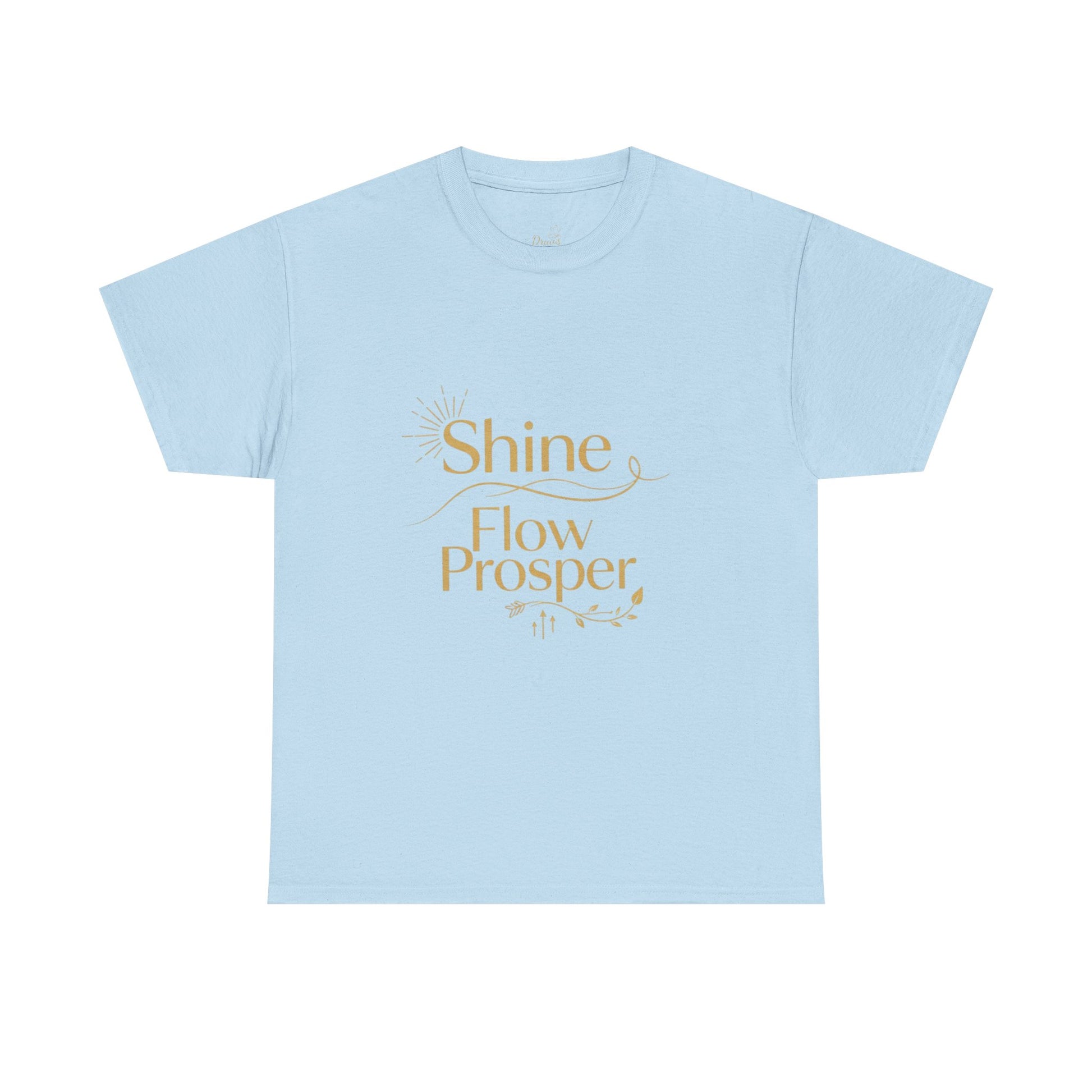 Elevate your wardrobe with the Shine Flow Prosper – Luxe Edition T-Shirt by Druvs. Featuring a golden affirmation print, this tee blends minimal elegance with spiritual purpose.