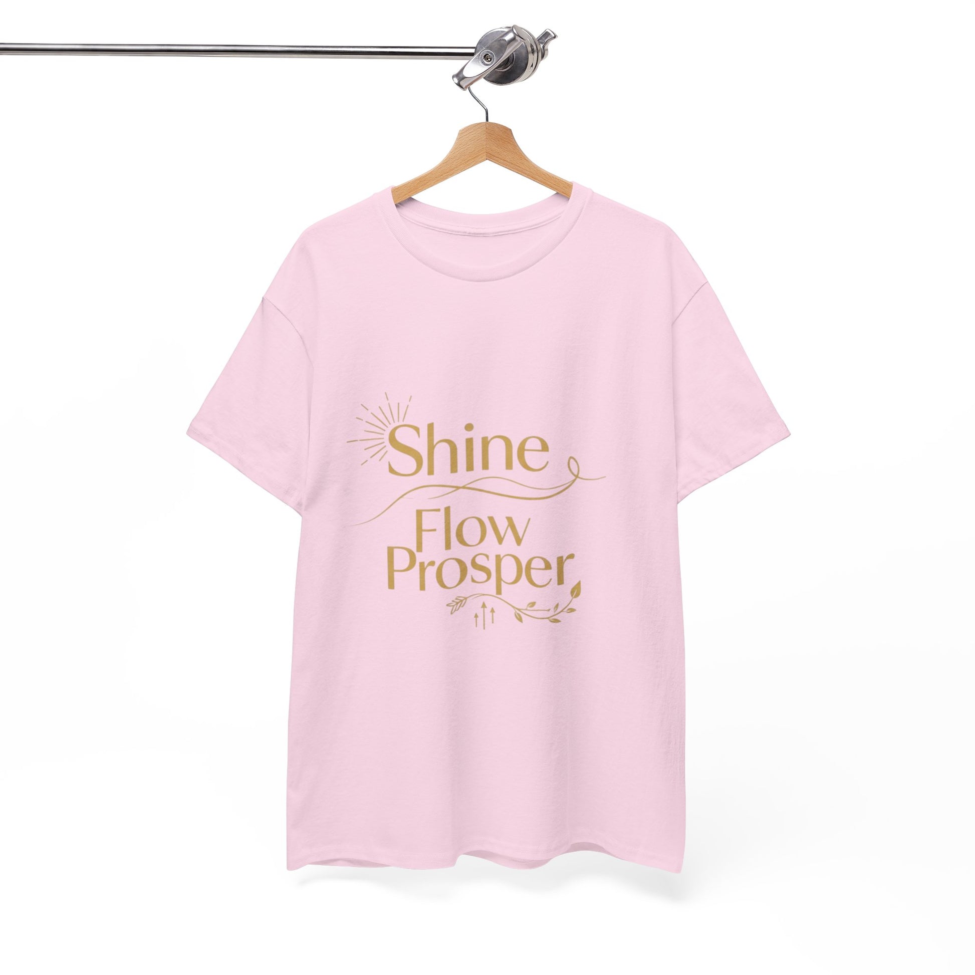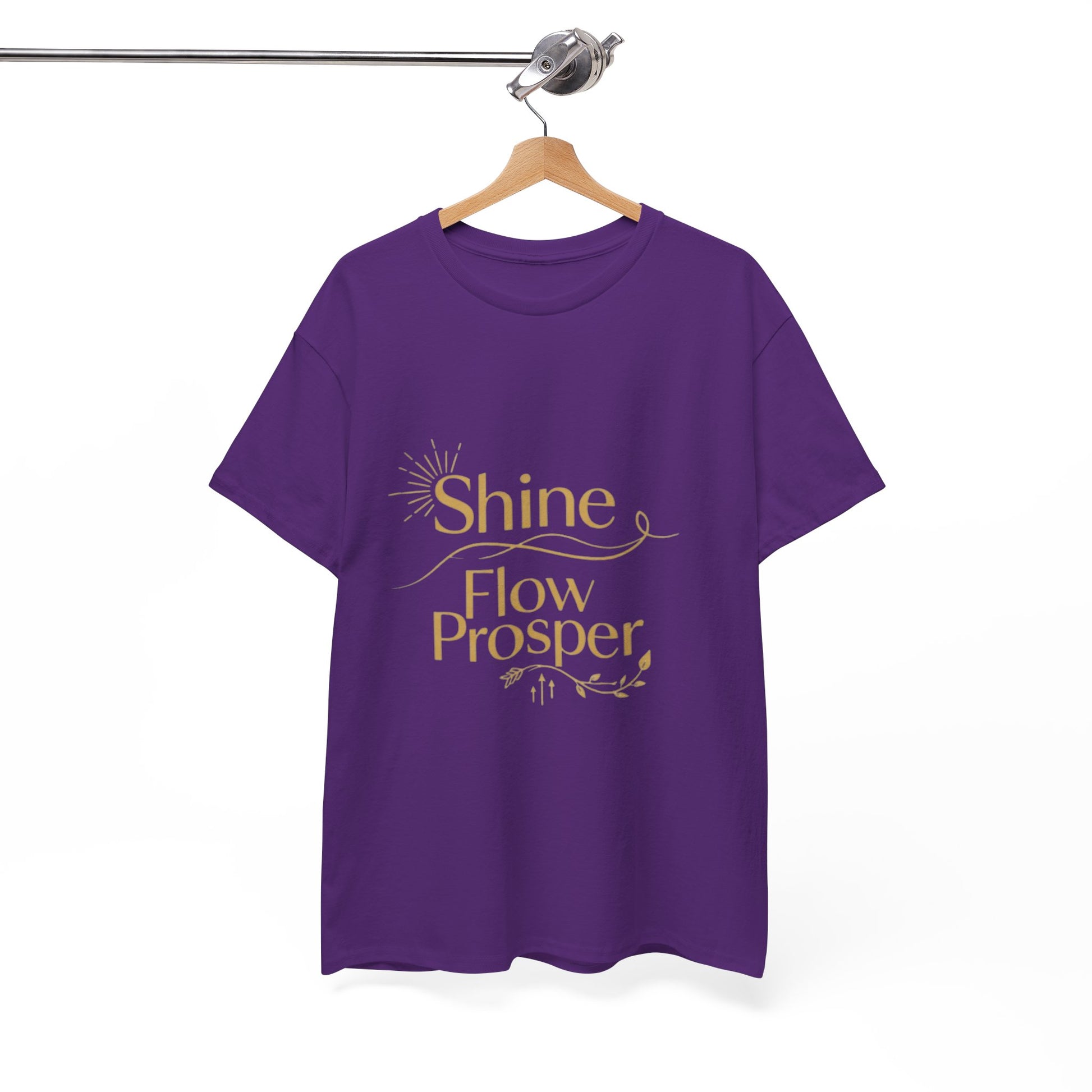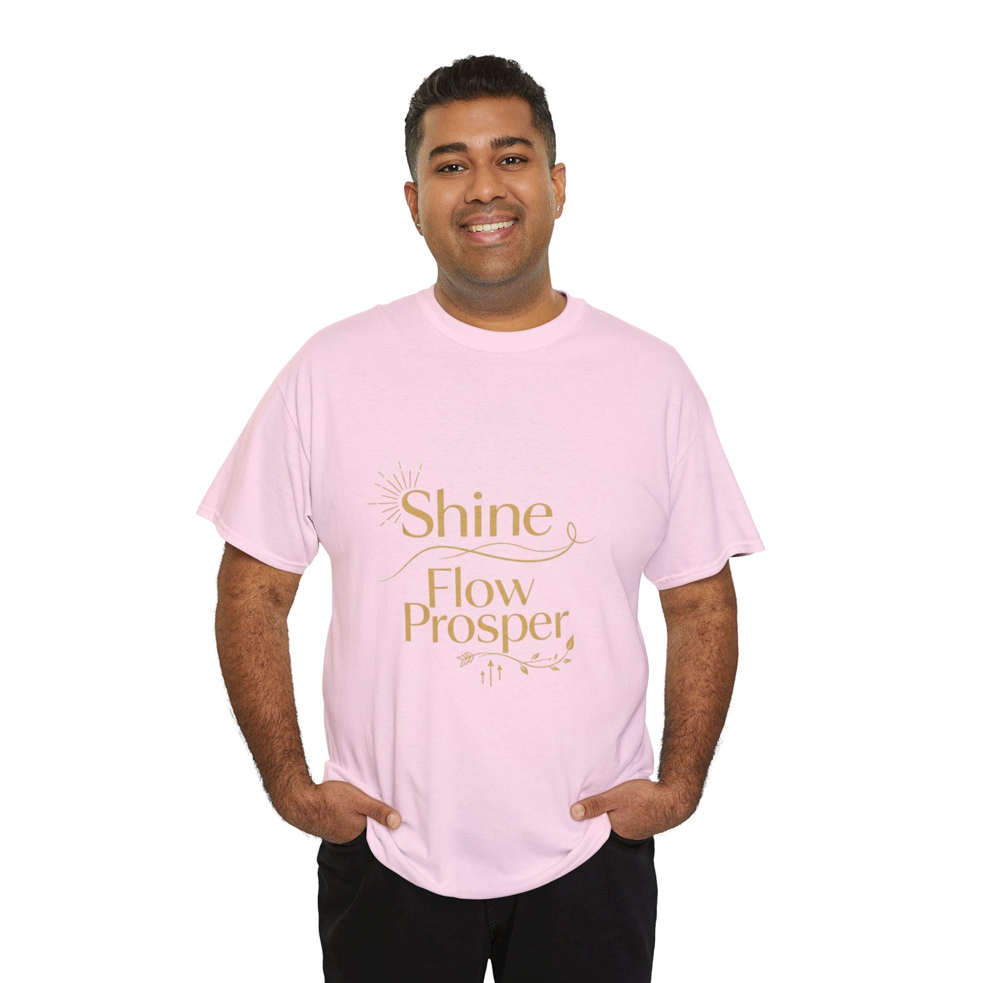 Elevate your wardrobe with the Shine Flow Prosper – Luxe Edition T-Shirt by Druvs. Featuring a golden affirmation print, this tee blends minimal elegance with spiritual purpose.