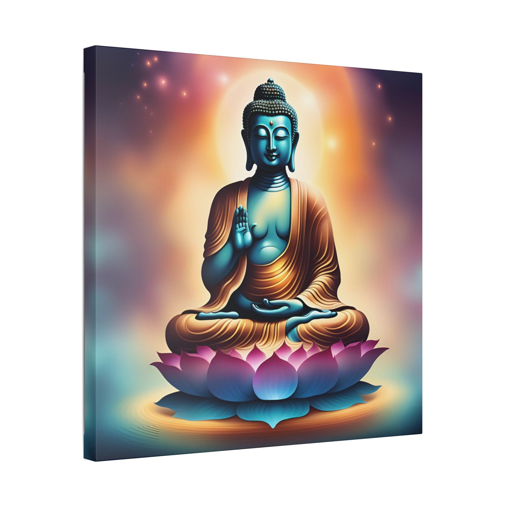 Infuse your sacred space with bold color and deep presence through this Vibrant Cosmic Buddha Canvas. Seated atop a radiant lotus, the Buddha extends a peaceful blessing hand, surrounded by a cosmic halo of soft purples, blues, golds, and glowing starlight. A visual invocation of balance, mindfulness, and inner power.